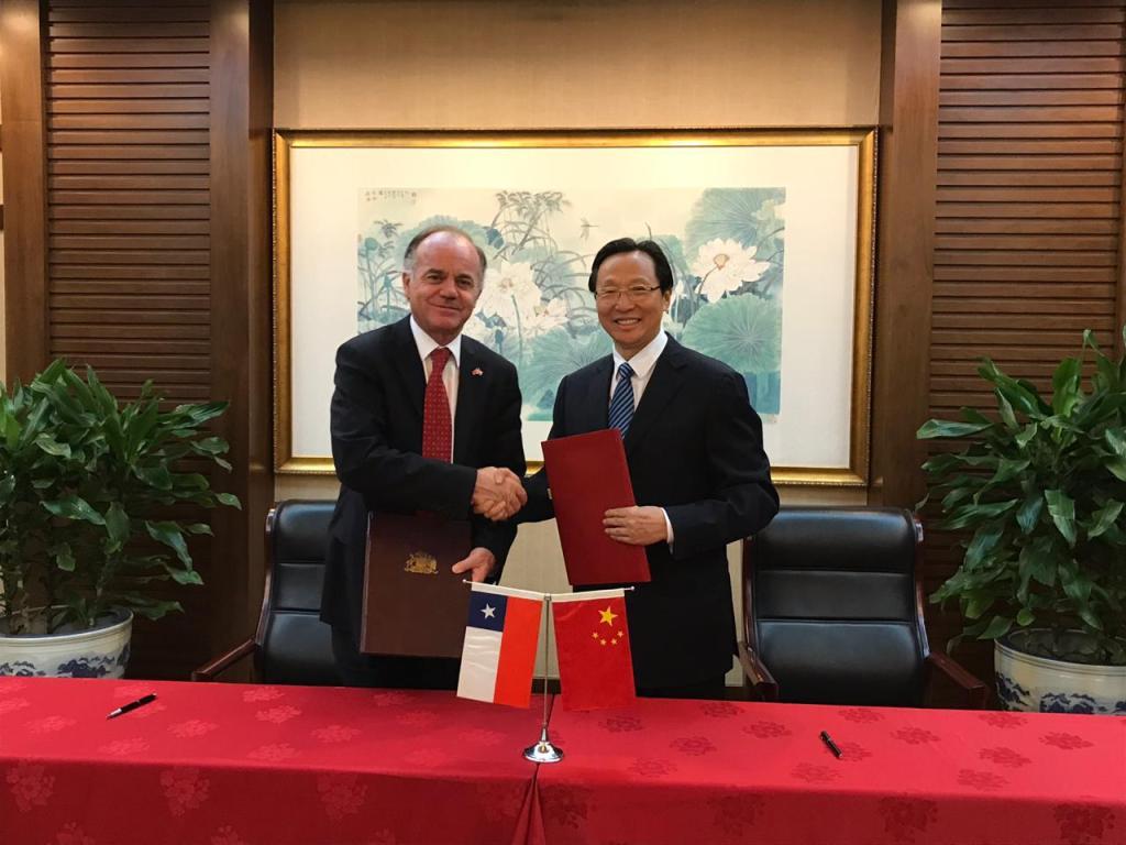 Beijing, 29 de agosto de 2019.- Una fructífera reunión sostuvieron el Ministro de Agricultura, Antonio Walker, con el Ministro de la Administración General de Aduanas chino, Ni Yuefeng, oportunidad en la que ambas autoridades ultimaron detalles de los que será la próxima apertura del mercado chino para los cítricos chilenos. En el encuentro, que se dio en el marco de la Chile Week 2019, ambas autoridades firmaron un preacuerdo que establece los parámetros de lo que será la firmar entre el presidente Sebastián Piñera y el presidente chino, Xi Jingping en la próxima APEC que se desarrollará en nuestro país.