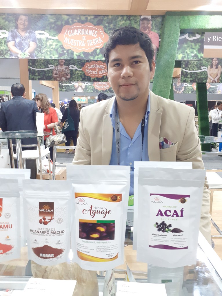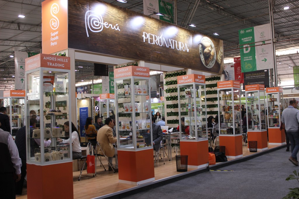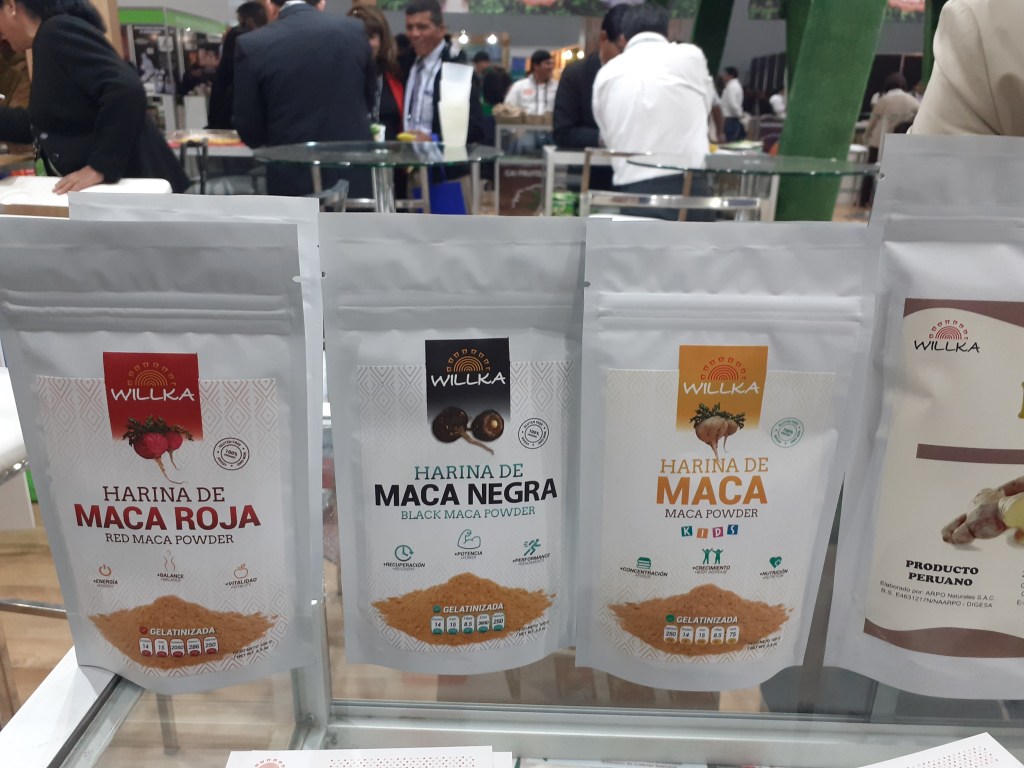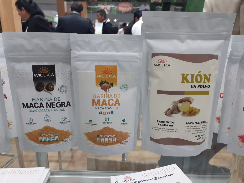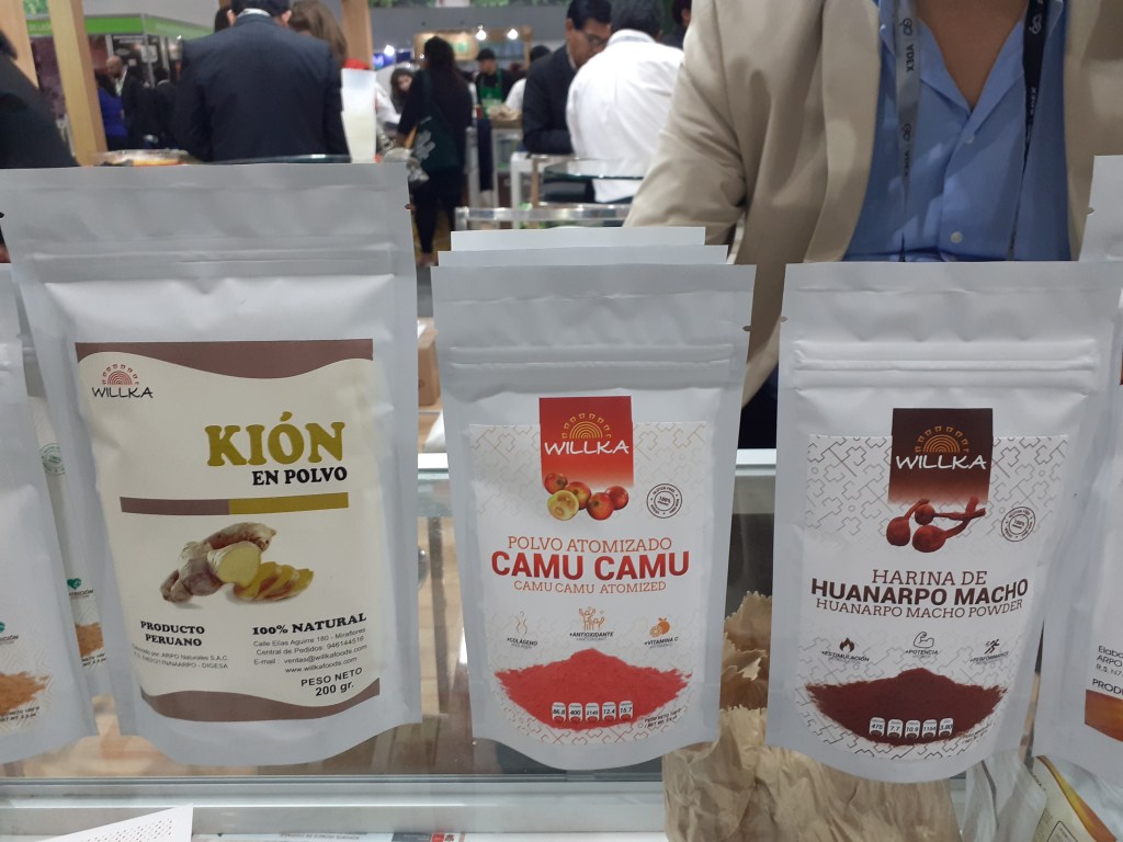 Se exhibieron asimismo la palta Hass, papas nativas, mandarina, mango, hojuelas de maca, plátanos, orégano, aguaymanto y piña deshidratadas, camu camu, granada, lúcuma, cacao, maca en polvo, hierbas aromáticas, chía, cúrcuma, yacón, kiwicha, sangre de grado, uña de gato, castaña, maíz morado, aceite sacha inchi, jengibre en polvo, panela, nibs de cacao, extracto de noni, pota, tilapia, trucha, paiche y otros más.