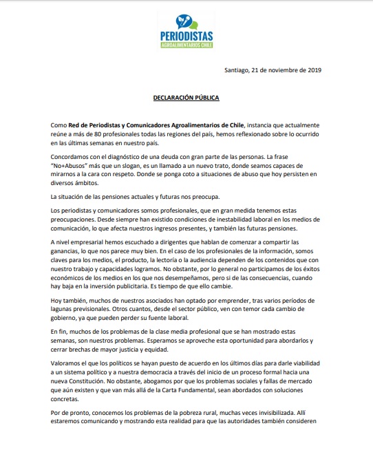 La Red de periodistas y Comunicadores Agroalimentarios de Chile emitió este jueves una declaración pública, respecto de la situación del gremio, del agro y del país, a un mes del inicio de las movilizaciones sociales.