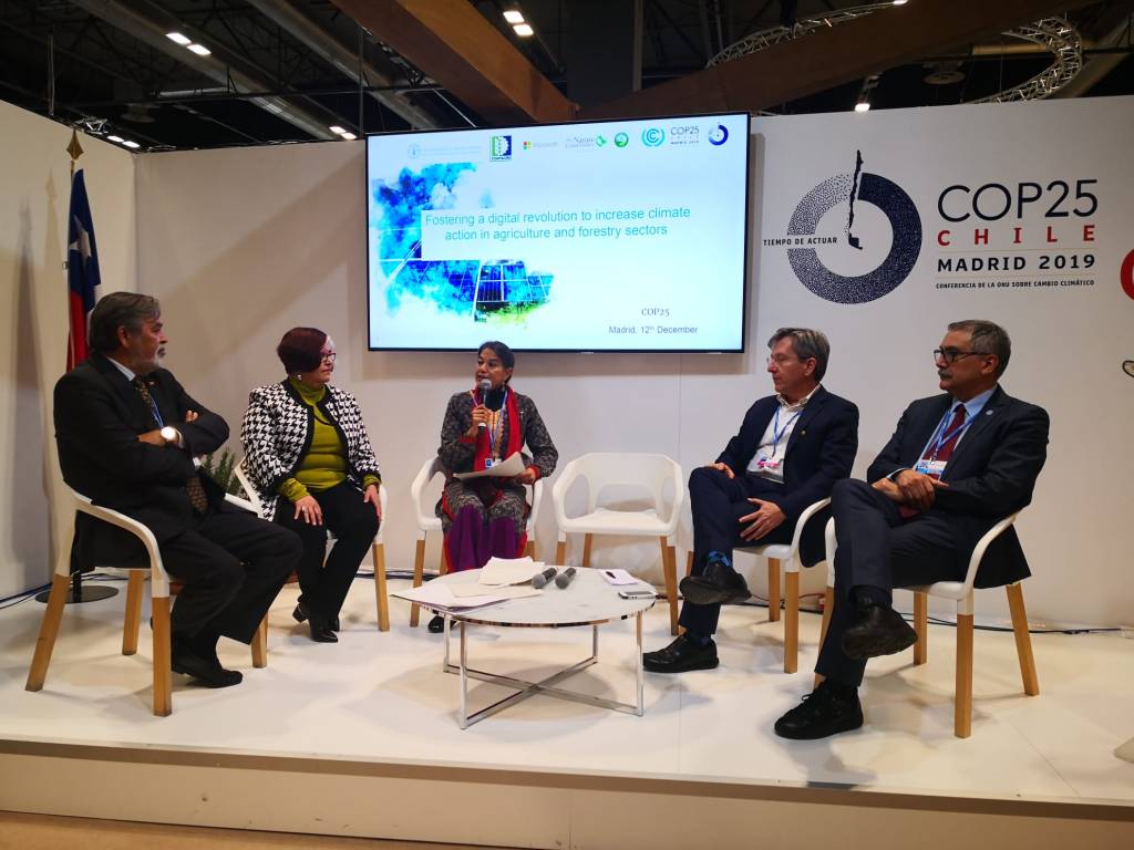 Madrid, España, 12 de diciembre de 2019.– El Director Nacional del Instituto del Instituto de Investigaciones Agropecuarias (INIA), Pedro Bustos, tuvo una destacada participación en el Side Event organizado por FAO en la COP25, instancia en la que participó en su calidad de presidente de Fontagro. El evento de hoy jueves denominado “Promoviendo la revolución digital para la acción climática en el sector agrícola y forestal”,