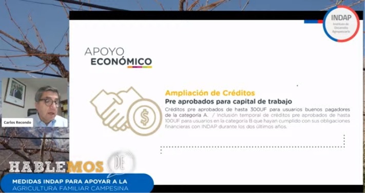El director nacional de INDAP, Carlos Recondo, destacó que “la agricultura familiar campesina ha seguido trabajando porque es necesario que la producción de alimentos llegue a todos los chilenos. Por eso hoy día lanzamos el conjunto de medidas para ayudar, fomentar y acompañar a la pequeña agricultura (…)”.