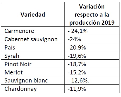 La baja en la producción de vinos durante esta temporada se relaciona estrechamente al efecto de la sequía que se ha mantenido durante varios años consecutivos, lo cual tuvo en esta temporada un efecto en los volúmenes de uva vendimiada al momento de la cosecha. Cabe señalar además que la cosecha se adelantó entre dos a tres semanas según valle vitivinícola respecto del año anterior, observándose un óptimo estado sanitario de la fruta.