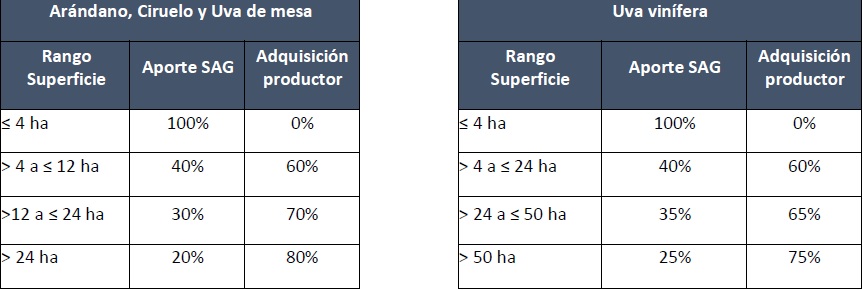 Para predios en donde la suma de las especies reglamentadas sea mayor a 4 hectáreas, la asignación se estableció bajo el Sistema de Reparto Compartido. La diferencia respecto a temporadas anteriores es que se establecieron rangos de superficie para la asignación de ECS por parte del SAG considerando porcentajes diferentes para el sector frutícola (arándano, ciruelo, vid de mesa) y para el sector vitivinícola, según las tablas publicadas a continuación:
