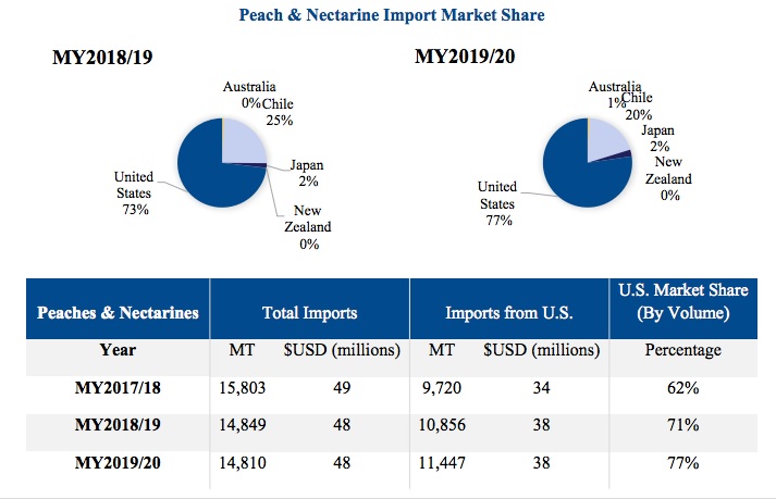 USDA pronostica que las importaciones de duraznos y nectarines aumentarán ligeramente llegando a las 15.000 TM en 2020. Chile es el prinicipal abastecedor de estas frutas en Taiwán.