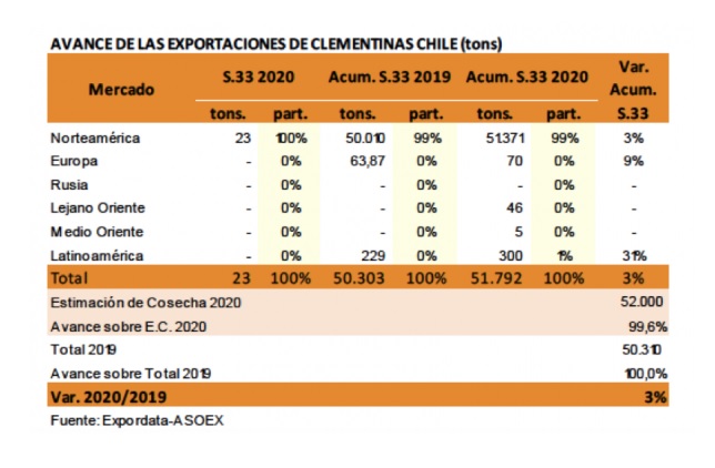 El Comité de Cítricos de Chile-ASOEX informó el cierre de la temporada 2020 para las clementinas, con volumen cercano a las 52.000 toneladas exportadas, volumen 3 por ciento mayor a la temporada anterior.