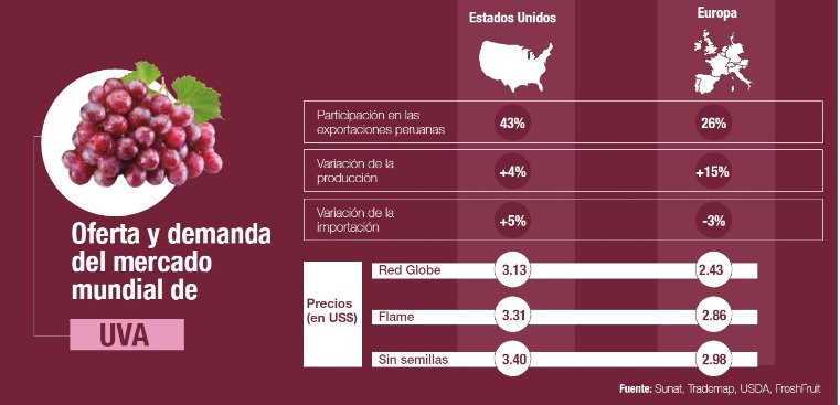 El principal proveedor de uva en el mundo es Chile, con 16% de participación. La campaña exportadora de este país va de diciembre a junio, con picos de envío entre los meses de febrero y mayo.
