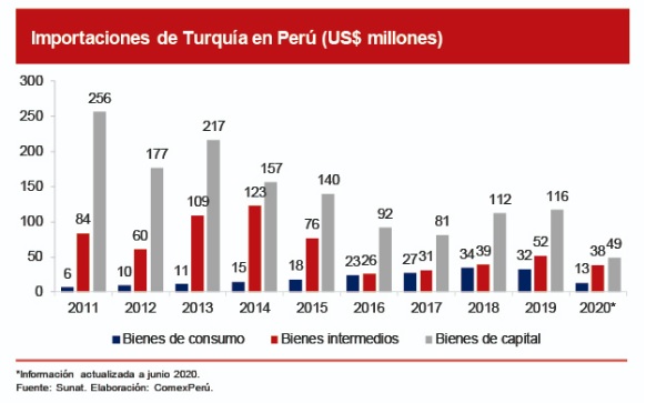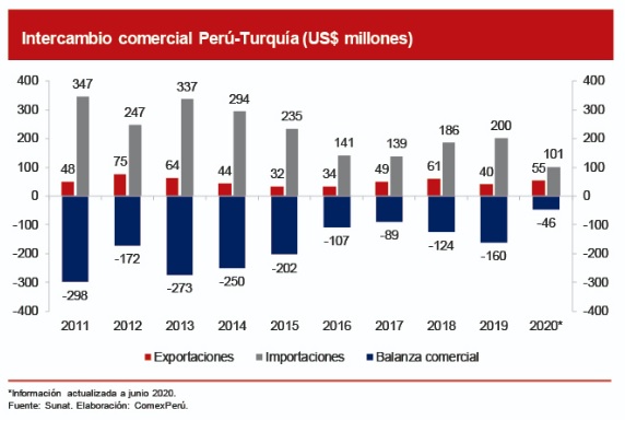 En cuanto al intercambio comercial, nuestras exportaciones a este país sumaron US$ 40 millones en 2019. Este monto, si bien es relativamente menor a lo comerciado con nuestros principales socios comerciales, refleja un nivel estable a lo largo del tiempo, lo cual indicaría que contamos con un mercado consolidado en favor de ciertos productos peruanos. Cabe resaltar que, entre enero y junio de 2020, nuestras exportaciones a Turquía sumaron US$ 55 millones, monto superior al reportado durante todo 2019 y un 387% mayor al registrado en el primer semestre de ese año. Por otro lado, nuestras importaciones han liderado nuestra relación comercial al sumar US$ 200 millones en 2019, un 8% más que 2018, año en que las importaciones turcas crecieron en un 34%, lo cual indica que el Perú es un importador neto de esta economía en beneficio de los consumidores y la industria peruana.