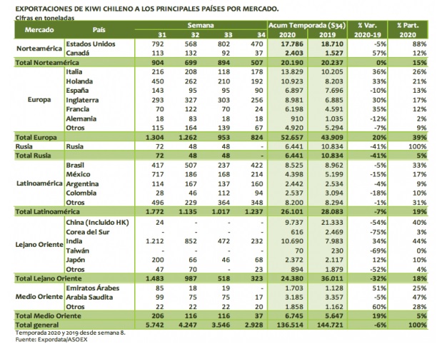 En cuanto a mercados, Europa se ubica como principal destino con la recepción de 52.657 toneladas de kiwis chilenos, y un incremento de 20% respecto a 2019. Mientras que Latinoamérica le siguen con 26.101 toneladas.