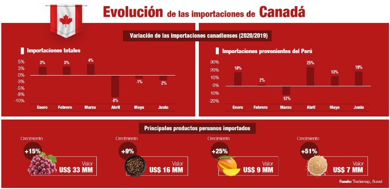 En el primer semestre del 2020, las importaciones de frutas, hortalizas y granos frescos en Canadá sumaron US$ 6,401 millones, valor similar al del 2019. De ese monto, US$ 126 millones fueron provistos por el Perú, que mostró un crecimiento de 10%. Gracias al buen desempeño de los envíos peruanos, se consolidó como su séptimo proveedor de alimentos.