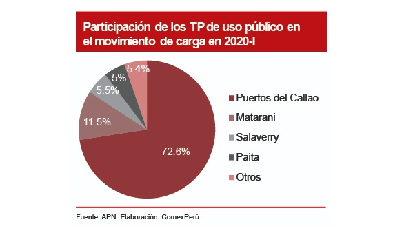 De acuerdo con cifras de la Autoridad Portuaria Nacional (APN), durante los primeros seis meses de 2020, los terminales portuarios (TP) a nivel nacional movilizaron una carga igual a 44.9 millones de toneladas métricas (TM), un 15.2% menos respecto del mismo periodo de 2019. Aproximadamente, 23.4 millones de TM correspondieron a los TP de uso público (52.1%), que constituyen los principales puertos del país[1]. Dentro de este grupo, el Terminal Norte Multipropósito movió 8.7 millones de TM; el Terminal de Contenedores Muelle Sur, 7 millones; y el Terminal de Embarque de Concentrados de Minerales, 1.2 millones, es decir, el 72.6% de la carga pasó por el Callao. Les siguieron los TP de Matarani, Salaverry y Paita, como aquellos que movilizaron más de un millón de TM.