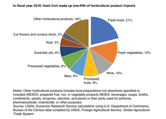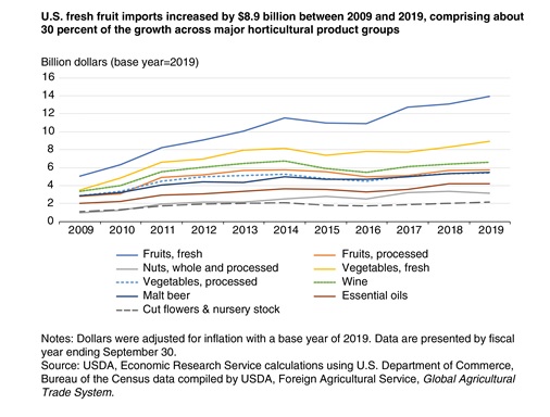 Con sus climas más cálidos y temporadas de cultivo alternas, los productos importados de estos países, junto con la producción nacional, aseguran un suministro durante todo el año de muchos tipos de productos frescos. Los estantes de los supermercados y las cocinas de los restaurantes de EEUU están abastecidos con tipos de frutas que solían consumirse, principalmente, durante parte del año o por una porción más pequeña de consumidores. Debido al mejor acceso facilitado por los acuerdos comerciales, el aumento de los ingresos disponibles de 2009 a 2019 y el interés en una mayor variedad de productos, la fruta fresca ha jugado un papel más importante en el crecimiento de EE. UU. importaciones agrícolas que cualquier otro tipo de producto hortícola en la última década.