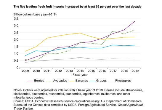 Los cinco principales productos de fruta fresca importados por valor representaron el 75 por ciento de todos los productos de EE. UU. importaciones de frutas frescas en el año fiscal 2019. Entre el año fiscal 2009 y el año fiscal 2019, las importaciones de frutos rojos aumentaron de USD$ 500 millones a USD$ 3.300 millones. Durante ese mismo período, las importaciones de paltas aumentaron de USD$ 0.6 mil millones a USD$ 2.7 mil millones, las importaciones de banano aumentaron de $ 1.2 mil millones a $ 2.2 mil millones, las importaciones de uvas aumentaron de $ 0.9 mil millones a $ 1.6 mil millones, y las importaciones de piña aumentaron de $ 0.4 mil millones a $ 0.6 mil millones (ver figura a continuación) .