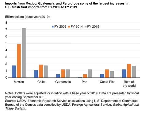 Un aumento de USD$ 600 millones en las importaciones de plátanos fue responsable de la mayor parte del aumento de USD$ 800 millones en las importaciones de frutas frescas de Guatemala desde el año fiscal 2009 al año fiscal 2019. El mayor aumento de un solo producto en Perú, durante la última década, lo que llevó a un aumento de USD$ 1.1 mil millones en las importaciones de EEUU de frutas frescas de ese país, fue el aumento de USD$ 0.4 mil millones en las ventas de arándanos. Costa Rica aumentó las ventas a los Estados Unidos de bananas y piñas en USD$ 0.2 mil millones cada una, lo que representó casi todo el aumento de USD$ 0.4 mil millones en importaciones de frutas frescas de Costa Rica.
