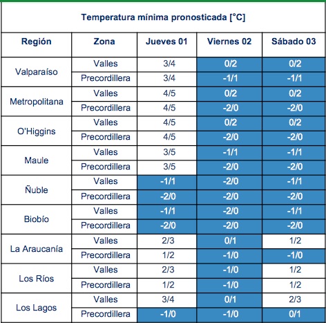 De acuerdo a información entregada por la Dirección Meteorológica de Chile (DMC), el ingreso de una masa de aire de características frías a la zona centro-sur, generará un descenso en las temperaturas mínimas, presentándose heladas matinales.