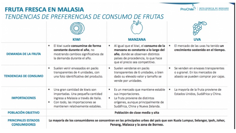 Un reciente informe de ProChile destaca las oportunidades para las frutas frescas chilenas en el mercado de Malasia. Chile actualmente exporta a este mercado Kiwis (6,3% de participación de mercado en 2019), Manzanas (0,1% de participación de mercado en 2019) y uvas de mesa (8,6% de participación de mercado en 2019).