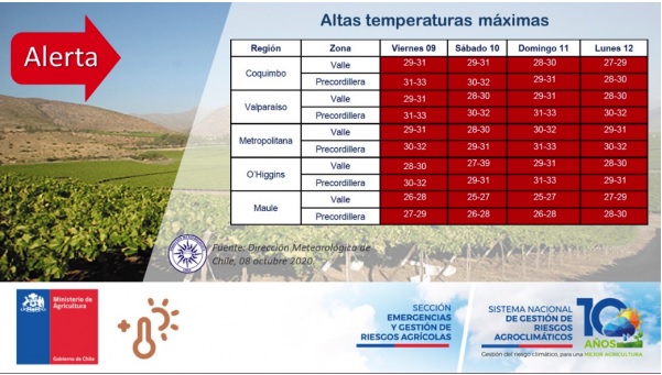 La Dirección Meteorológica de Chile ha informado de una alerta meteorológica desde hoy viernes hasta al menos el próximo lunes. La Dirección comenta que las temperaturas máximas estarán sobre lo normal para la época en la zona central, valles y precordillera, con registros de máximos de 33 grados en la zona precordillerana de Valparaíso y hasta los 32 grados en la precordillera de la Región Metropolitana. En tanto en la precordillera de Coquimbo se esperan máximas de 33 grados, O’Higgins de 32 grados y Maule de 30 grados.