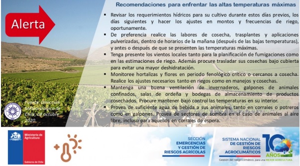 Se proyectan temperaturas normales para la época en la Región de Los Lagos, en tanto hasta la Región de La Araucanía podrían presentarse temperaturas máximas ligeramente por sobre lo normal. Esta semana en el Norte Chico, las tardes despejadas y la probabilidad de temperaturas ligeramente cálidas que se pronostican, podrían generar un aumento en la demanda hídrica de los cultivos por lo que se recomienda monitorear diariamente los pronósticos y sus estimaciones de evapotranspiración de sus cultivos para hacer los ajustes correspondientes en los riegos. Prefiera las mañanas para regar, realizar trasplantes y fumigaciones y procure además revisar el avance fenológico de su cultivo sin dejar de realizar las inspecciones fitosanitarias programadas. Mantenga bebederos con agua permanentemente para sus animales, especialmente en valles interiores y precordilleranos.