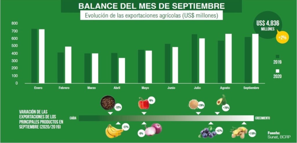 De acuerdo a las estimaciones de FreshFruit, las exportaciones peruanas de productos agrícolas en septiembre alcanzaron los US$ 664 millones, 7% más en comparación al mismo mes en el 2019. La buena acogida de los productos peruanos en los últimos meses ha contrarrestado el impacto que tuvo la cuarentena entre abril y junio, periodo en que las exportaciones agrícolas cayeron 7% en promedio. Es así que los envíos peruanos han sumado US$ 4,836 millones en lo que va del año, 2% más en comparación al año anterior. Estos resultados convierten al sector agrícola en el único motor de la economía que sigue creciendo, a pesar del contexto de incertidumbre internacional.