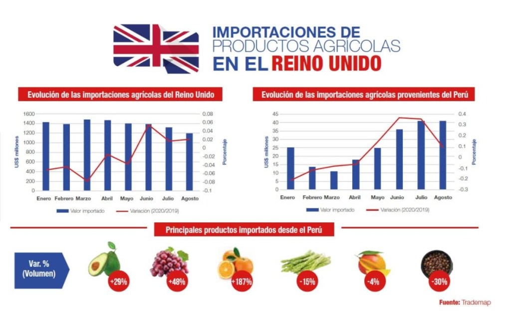 A pesar del contexto difícil que están atravesando, los consumidores dejaron en evidencia su preferencia por adquirir productos agrícolas de origen peruano. Las importaciones provenientes del Perú, entre enero y agosto, sumaron US$ 211 millones, 8% más en comparación al 2019. La buena acogida permitió que el Perú se posicione como el décimo segundo proveedor de frutas, hortalizas y granos del Reino Unido, con 2% de participación, desplazando a Colombia y Canadá.
