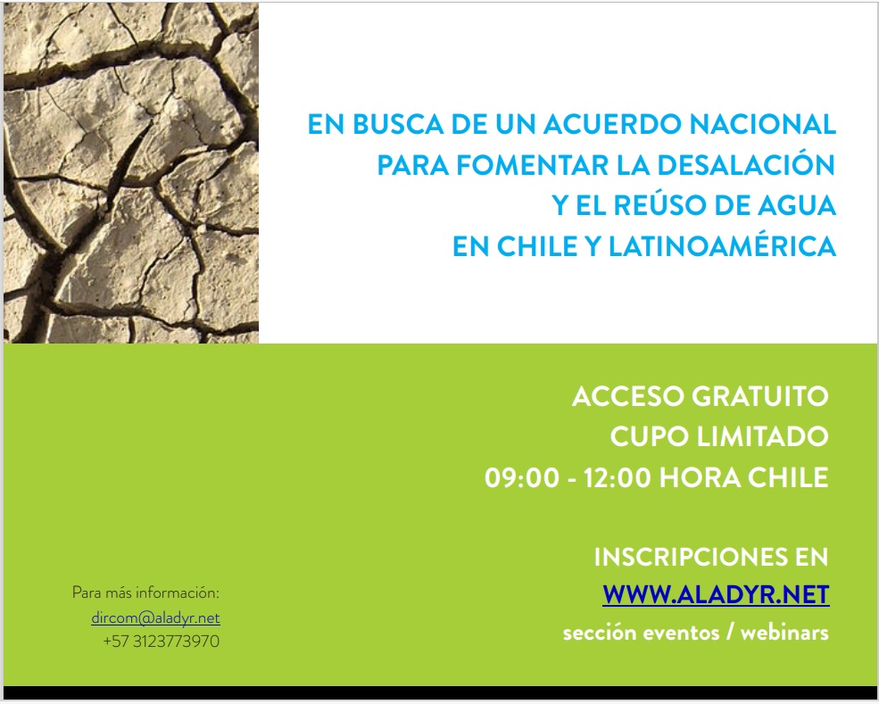 La Asociación Latinoamericana de Desalación y Reúso de Agua (ALADYR) convocó a diversos actores de relevancia y experiencia en la gestión hídrica a formar parte del foro “Políticas Públicas para Garantizar el Acceso al Agua”, cuya participación es gratuita y permite esbozar las bases para cambiar la realidad de Chile marcada por la sequía más larga de su historia.