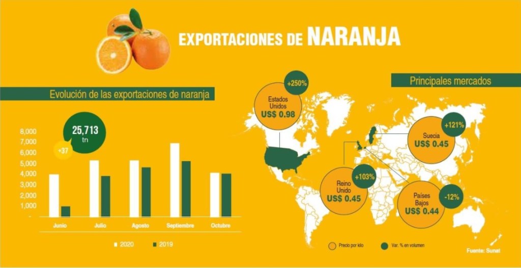 Entre enero y octubre (hasta el día 26), los principales destinos de las exportaciones peruanas de naranja fueron el Reino Unido, con 62% de participación; los Países Bajos, con 25%; Suecia, con 4%, y Estados Unidos, con 3%.