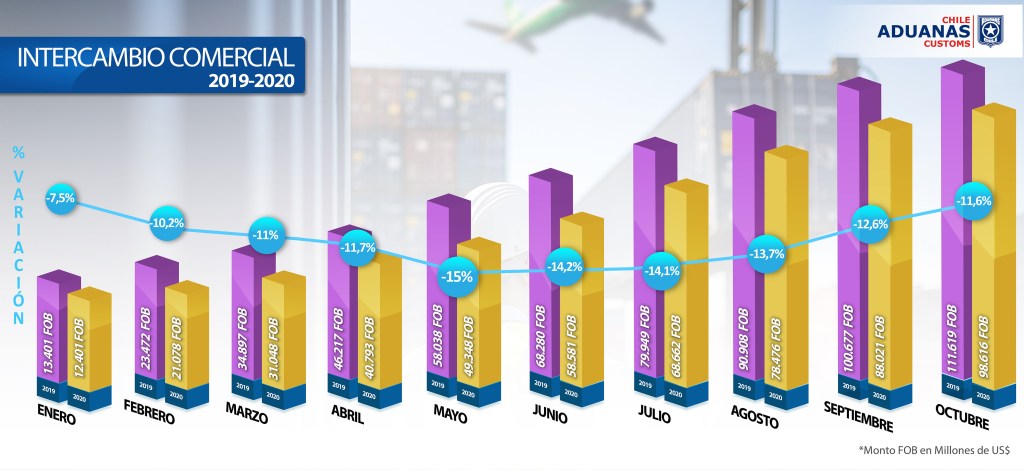El intercambio comercial de Chile con el mundo entre el 1° de enero y el 31 de octubre de 2020 alcanzó US$ 98.616 millones, cifra que presentó una variación negativa del 11,6% respecto a igual período del 2019, según consigna el Reporte de Comercio Exterior que elabora mes a mes el Departamento de Estudios del Servicio Nacional de Aduanas.