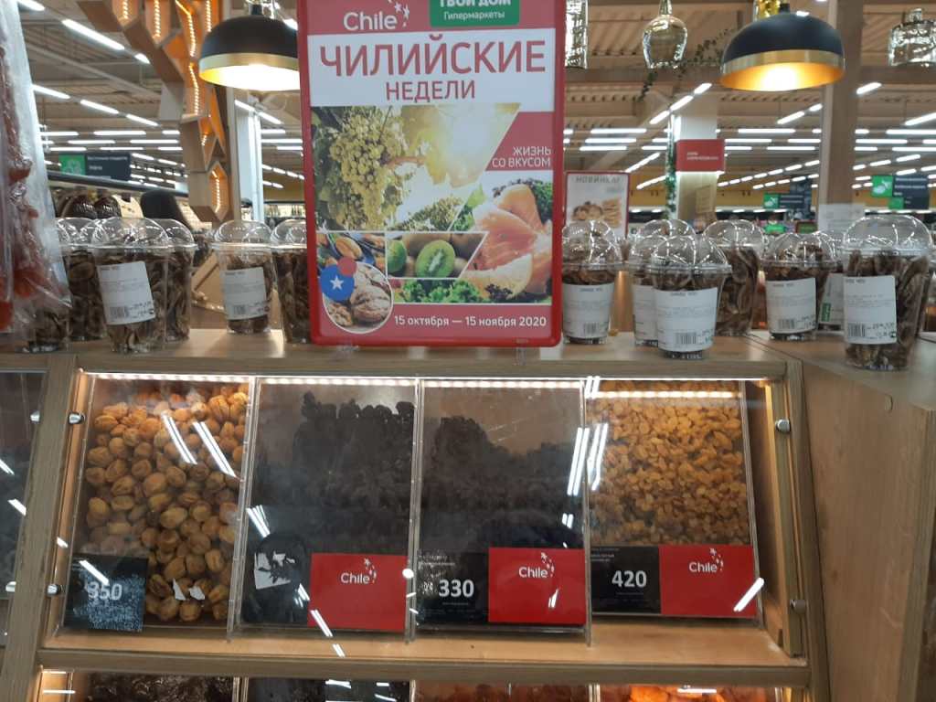Con presencia en los 5 hipermercados más grandes de Moscú de la cadena Tvoy Dom, además de sus canales digitales, las góndolas se llenaron de la imagen de Chile y de islas dentro del supermercado destacando productos como vinos, pisco, mejillones, salmón, queso, nueces, almendras, pasas, ciruelas deshidratadas y fruta fresca.