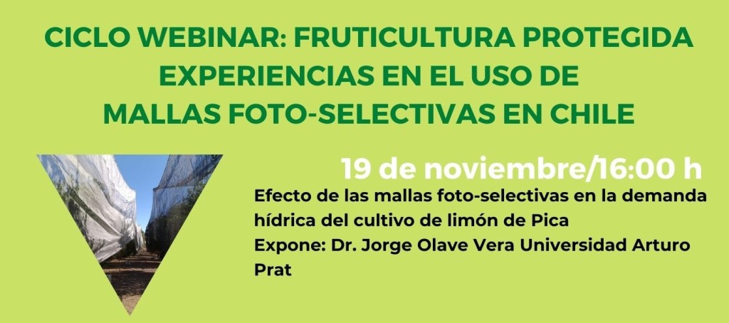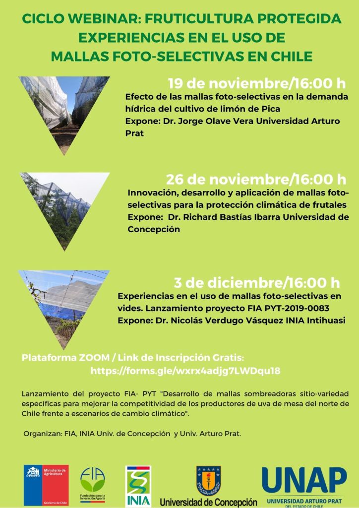 El 19 de noviembre a las 16:00 se realizará el webinar: Efecto de las mallas foto-selectivas en la demanda hídrica del cultivo limón de Pica, en donde expone el Dr. Jorge Olave de la Universidad Arturo Prat, el 29 de noviembre a las 16:00 horas se realizará el webinar: Innovación, desarrollo y aplicación de mallas foto-selectivas para la protección climática de frutales , con presentación del Dr. Richard Bastias de la Universidad de Concepción y el 3 de diciembre finaliza el ciclo a las 16:00 horas con: Experiencias en el uso de mallas foto-selectivas en vides. Lanzamiento proyecto FIA PYT en donde presentará el Dr. Nicolás Verdugo de INIA Intihuasi, para inscribirse deben ingresar a: https://forms.gle/wxrx4adjg7LWDqu18