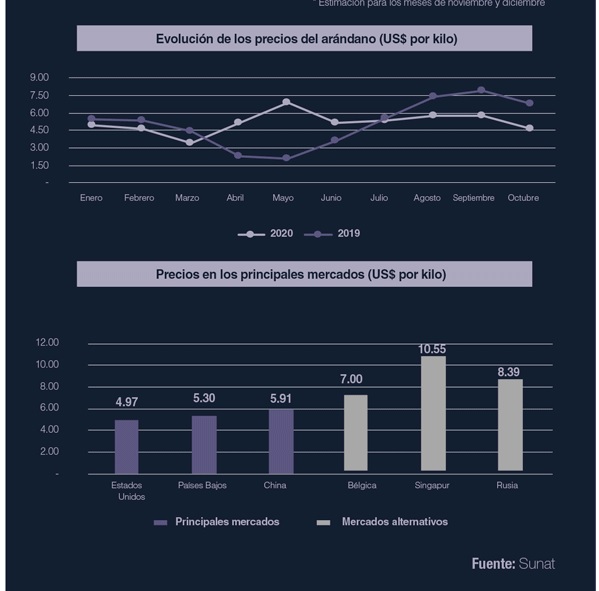 A la búsqueda de nuevos mercados se suma el control de los envíos. Algunos exportadores han empezado a congelar producto y otros a destinar un mayor volumen al mercado doméstico. La idea es no seguir presionando a la demanda internacional con más arándano. Debido a todo ello, en el 2020 se estima que, en términos anuales, las exportaciones de arándano alcancen las 167 mil toneladas por un valor de US$ 860 millones. El crecimiento será de 30% en volumen y de 4% en valor, pero no alcanzará para superar la barrera de US$1,000 millones o superar a la uva, que ha tenido un gran inicio de campaña. Todo parece indicar que este año, el arándano retendrá el segundo lugar y habrá que esperar al 2021 para ver si se supera la barrera.