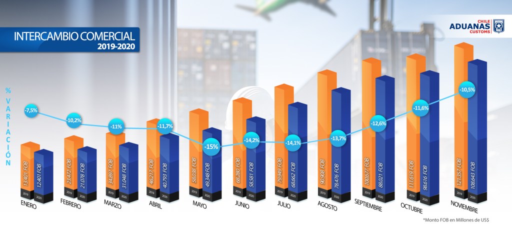 Noviembre mostró positivos signos de recuperación para el comercio exterior al registrar exportaciones por US$ 5.436,9 millones y un 10,4% de incremento al compararlas con el mismo mes del 2019. Así lo evidencian las cifras que periódicamente sistematizada el Departamento de Estudios del Servicio Nacional de Aduanas. Al contrario, las importaciones disminuyeron un 8,1% al alcanzar un monto de US$ 4.721,5 millones.