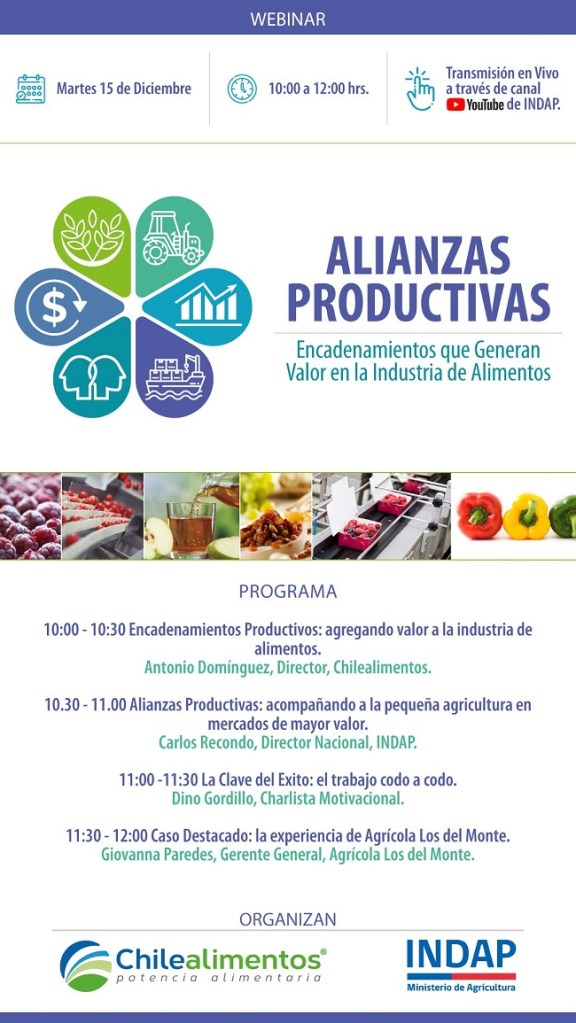 “Encadenamientos que generan valor en la industria de los alimentos” es el lema del webinar, abierto a todo público, y que para seguirlo solo es necesario acceder a través del canal de Youtube de INDAP (al que se puede ingresar clickeando aquí) o desde los sitios WWW.INDAP.GOB.CL y WWW.CHILEALIMENTOS.COM