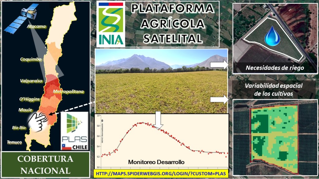 La Plataforma Agrícola Satelital (PLAS) corresponde a un sistema on line implementado por INIA – en donde es posible consultar el estado de desarrollo de cualquier cultivo ubicado entre las regiones ya mencionadas, a través de un servidor de mapas en línea (Web Map Server) en el cual se alojan series temporales del índice de vegetación satelital NDVI y valores del coeficiente de cultivo. Estos datos son utilizados juntamente con la Plataforma web desarrollada por la Universidades de Talca y de Chile, la cual genera información especializada de la evapotranspiración de referencia (ETo), a través de mapas dinámicos. Lo anterior se logra a través del uso de imágenes del satélite MODIS-TERRA (NASA) y la información meteorológica proveniente de las estaciones de la Red Agrometeorológica Nacional (RAN).