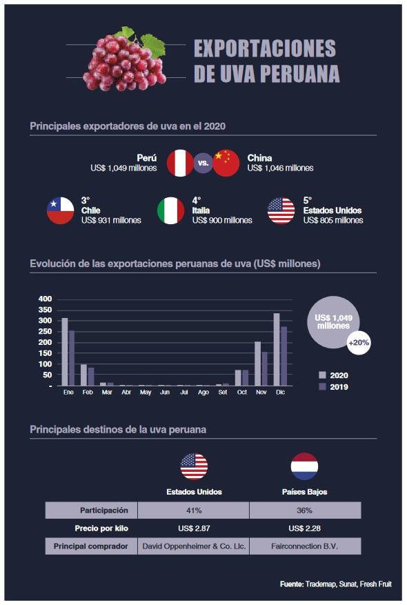 Ante la vorágine de resultados de cada país, el Top 5 de principales proveedores de uva en el 2020 sufrió una alteración con respecto al del 2019. Hasta el 2019, China era el principal exportador, con US$ 987 millones despachados al exterior ese año, seguido por Chile (US$ 950 millones), Estados Unidos (US$ 856 millones), el Perú (US$ 872 millones) e Italia (US$ 720 millones). De acuerdo con estimaciones de FreshFruit, debido a sus problemas de producción, para el 2020, Estados Unidos caería al quinto lugar con US$ 805 millones en envíos, mientras que Italia, subiría al cuarto lugar con US$ 900 millones. Chile, que fue el más afectado por la pandemia, retrocedería al tercer lugar con US$ 931 millones, y el Perú y China Continental (sin incluir Hong Kong), registrarían un empate en el primer lugar.
