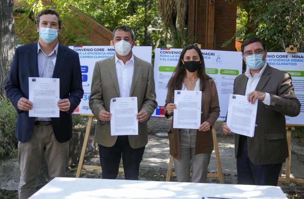Una inversión de $30 mil millones para la eficiencia hídrica y el cambio climático considera el “Convenio de Programación Metropolitano” firmado esta tarde por la Ministra de Agricultura, María Emilia Undurraga; el intendente Metropolitano, Felipe Guevara; el presidente del Consejo Regional, Felipe Berríos y el Seremi de Agricultura, José Pedro Guilisasti.