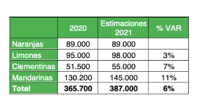 El Comité de Cítricos Asoex, prevé para la temporada 2021 un aumento del 6% en el volumen en las exportaciones de cítricos. Lo que se traduce a un volumen total de envíos de 387.000 toneladas. Las mismas estimaciones indican que la mayor alza será por parte de las mandarinas, con una variación de 11%, de acuerdo a la temporada anterior, seguido por las clementinas con 7%. En cuanto a los limones presentarán una variación del 3%, mientras las naranjas no tendrán variación.