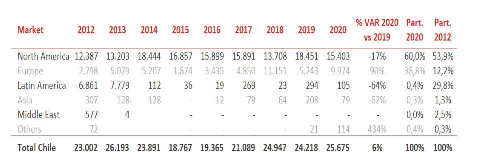 La campaña de manzanas de Chile 2020 se vio afectada por la sequía de 2019 y terminó con poco menos de 650.000 toneladas exportadas (una caída del 4% interanual, según los datos del registro de frutas de Ciren-Odepa. Sin embargo, los volúmenes exportados de manzanas orgánicas aumentaron un 6% interanual a 25.675 toneladas. La participación de las manzanas orgánicas en las exportaciones totales de manzanas también ha aumentado, pasando del 3,6% en 2019 al 3,9% en 2020.