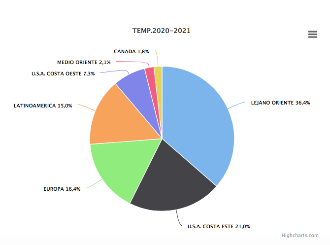 Los mercados europeos han recibido 276.432 ton, Latinoamérica 253.436 ton, Medio Oriente 35.456 ton, y Canadá 30.488 toneladas de frutas frescas chilenas.