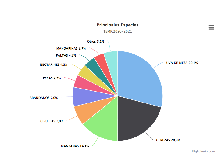 En cuanto a destino, el principal mercado de las uvas de mesa (52% del total de los envíos al mundo), los arándanos (72,3% del total) y mandarinas (91 % del total) es Estados Unidos. De las cerezas (94,9% del total enviado al mundo), ciruelas (50,5% del total) y nectarines (42,3%) es Asia, especialmente China.