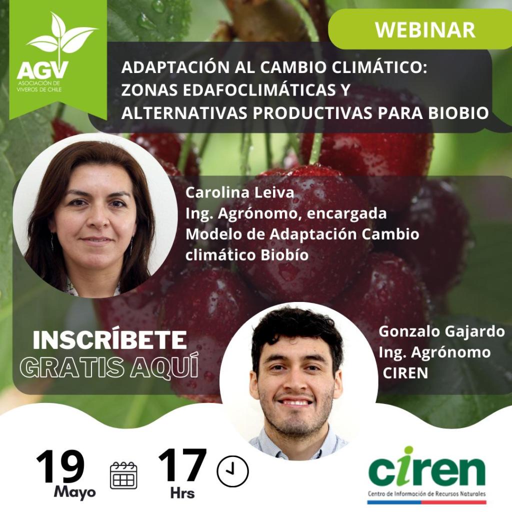 El cambio climático y sus efectos ya está influyendo a una buena parte de nuestro país y el mundo fruticultor está alerta ante las eventualidades que puede generar esta nueva condición meteorológica. Es por esta razón que Viveros de Chile A.G. en conjunto con el Centro de Información de Recursos Naturales, CIREN, realizarán el webinar “Adaptación al cambio climático: zonas edafoclimáticas y alternativas productivas para Biobío”, el próximo 19 de mayo desde las 17.00 Horas a traves de la plataforma ZOOM.