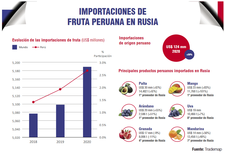 En el 2020, las importaciones de fruta de Rusia sumaron US$ 5,189 millones, un valor similar al de los últimos dos años. A pesar de la situación estable, las frutas peruanas han tenido un buen desempeño, ya que Rusia pasó de adquirir US$ 66 millones en el 2018 a US$ 124 millones en el 2020, lo que significó un crecimiento de 89%.