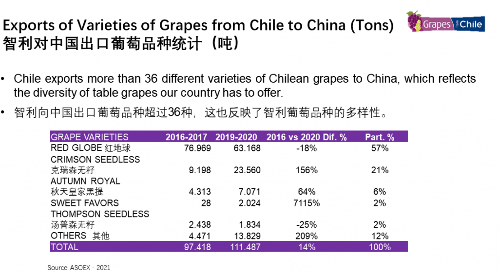 En general, los productores y exportadores chilenos de uva de mesa continúan invirtiendo en la diversificación de su oferta de variedades a China y otros mercados globales, y el Comité Uva de Mesa de Chile de ASOEX ha continuado apoyando el consumo en el mercado chino a través de promociones online y offline.