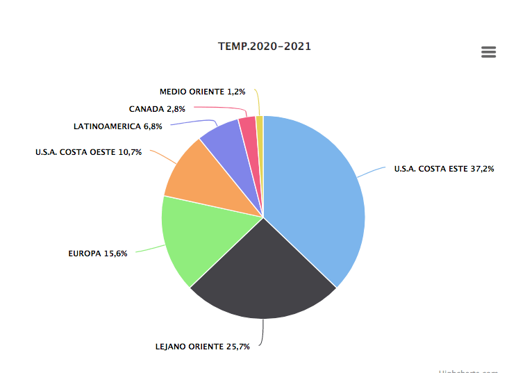 En términos de mercado, Estados Unidos se ubica como principal destino como 256.946 toneladas recibidas, seguido por Asia con 137.751 T, Europa con 83.413 T, Latinoamérica con 36.722 T, Canadá con 14.983 T y Medio Oriente con 6.432 toneladas.