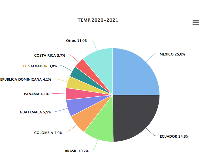 En Latinoamérica, los principales destinos fueron México con 9.196 toneladas, Ecuador con 9.097 T, Brasil con 3.914 T, y Colombia con 2.563 T.