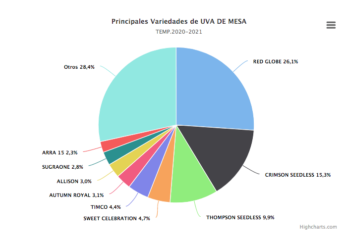 Cuando se trata de variedades, los principales volúmenes exportados corresponden a Red Globe con 139.888 T, Crimsom Seedless con 81.786 T, Thopsom Seedless con 53.321 T, y Sweet Celebration con 25.135 T , destacando un incremento de 43%.