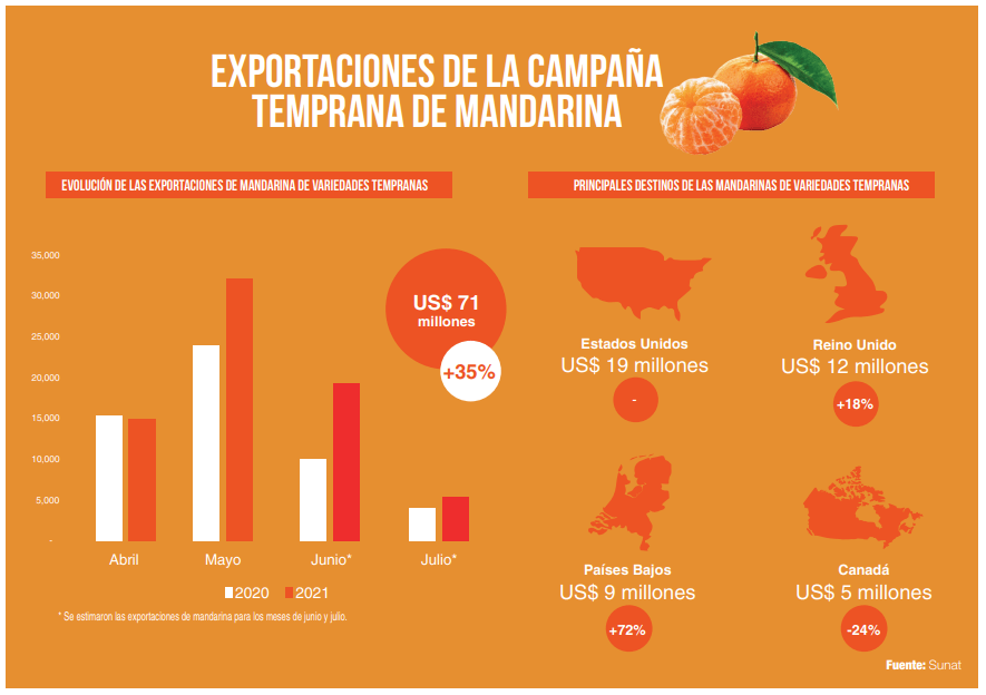 Hasta el 20 de junio, las exportaciones de mandarina de variedades tempranas sumaron 54,037 toneladas por US$ 61 millones. En comparación al mismo periodo del 2020, los envíos de la fruta crecieron 25% en volumen y 30% en valor. De acuerdo con las estimaciones de FreshFruit, al final de la campaña de variedades tempranas (en julio), las exportaciones de mandarina podrían llegar a sumar 62,570 toneladas por US$ 71 millones, lo que podría significar un crecimiento de 31% en volumen y 35% en valor con respecto a la campaña anterior del 2020.