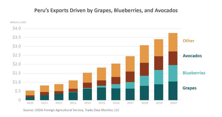 Al respecto, el documento señala que las exportaciones de frutas de Perú han crecido rápidamente durante la última década, pasando de solo USD$540 millones en 2010 a USD$3.8 mil millones en 2020,ubicando a Perú entre los 10 principales países exportadores de fruta del mundo desde 2017.