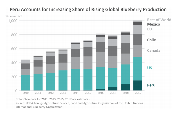Según las Estadísticas de Comercio de Productos Básicos de las Naciones Unidas, Perú comenzó a exportar arándanos frescos en cantidades mínimas en 2010. Entre 2010 y 2019, tanto la producción como las exportaciones han crecido de casi cero a más de 140.000 y 125.000 toneladas, respectivamente, con exportaciones de 2019 valoradas en más de USD$ 800 millones. El punto de lanzamiento del arándano peruano se produjo en 2013 cuando las exportaciones ascendieron a USD$ 1 millón por primera vez, aumentando de casi USD$ 500,000 en 2012 y a más de USD$ 17 millones en 2013.