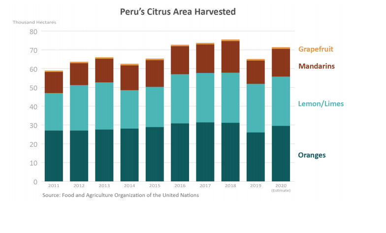 El análisis de USDA indica que la superficie de cítricos cosechada en Perú ha tenido una tendencia al alza, alcanzando más de 75.000 hectáreas en 2018. Los datos del área cosechada del USDA no están disponibles, pero según los datos de la FAO, el área de cítricos cosechado se redujo en 2019 a 65.000 hectáreas (los datos de 2020 se estiman al alza).