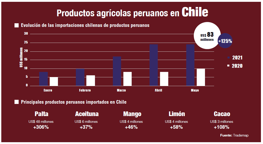 Durante estos meses, las compras chilenas desde el Perú fueron del orden de US$ 83 millones, 125% más con respecto al 2020. Gracias a este resultado, el Perú se posicionó como el tercer proveedor de alimentos en Chile, con 9% de participación (4 puntos porcentuales más), desplazando a Ecuador y Brasil. Los principales productos agrícolas peruanos que se comercializaron en Chile fueron la palta (57% de participación), la aceituna (7%), el mango (5%), el limón (5%) Y el cacao (3%).