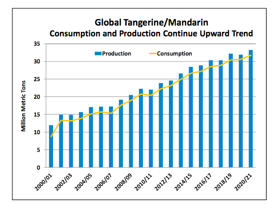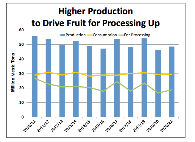 El consumo y las exportaciones son proyectadas al alza, mientras que se espera que la fruta para procesamiento caiga casi un 20% en Argentina, México y Estados Unidos. Esta es la primera disminución de producción en 3 años para Estados Unidos, atribuida a menores rendimientos en el Valle de San Joaquín debido a la sequía. En tanto, en Argentina hay menos fruta disponible para procesar dada la caída de la producción. En México hay más fruta. Se espera que se consuman a nivel nacional con una mayor demanda de productos que contienen vitamina C.